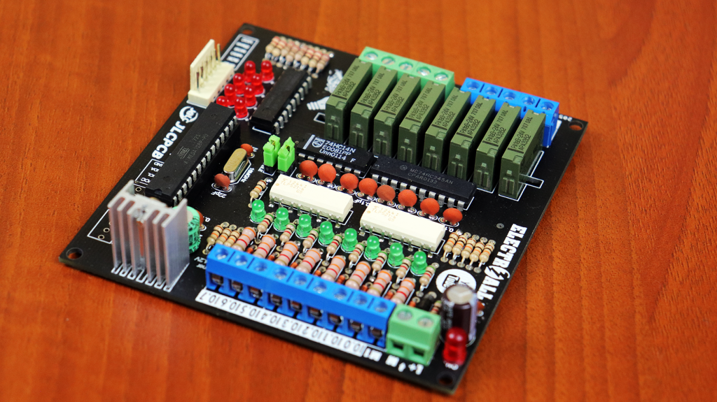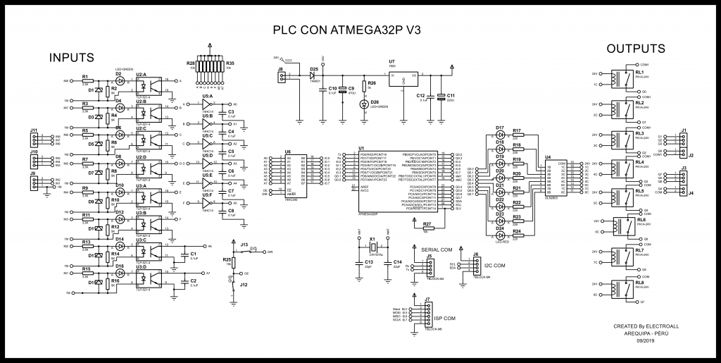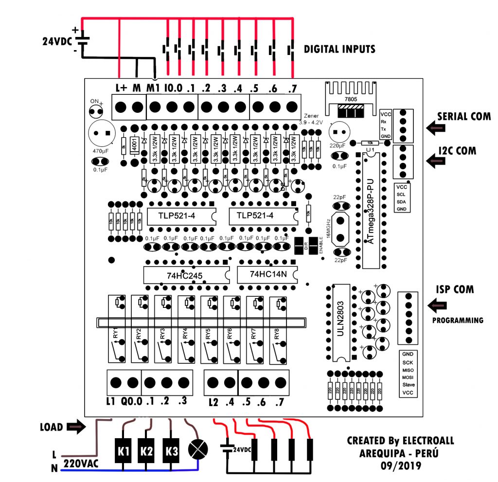 PLC con arduino (ATmega328p) V3 “DIP”, es un controlador lógico programable que fue diseñado por Electroall, cuyo circuito esta basado en el dispositivo de PLC SIEMENS S7 1200 CPU1214c con salidas de relés, por ende la tarjeta que se diseñó se alimentará con 24VDC, consecuentemente las entradas también serán de 24VDC, si bien es cierto el PLC de siemens tiene 14 entradas y 10 salidas, en este caso solo tendremos 8 entradas y 8 salidas. Para el sistema de control se está haciendo uso de un micro-controlador ATmega328p ideal para que sea programado con el IDE de arduino, cabe señalar que el sistema de control está altamente aislado de las eventos externos que vienen ser las entradas y las salidas.