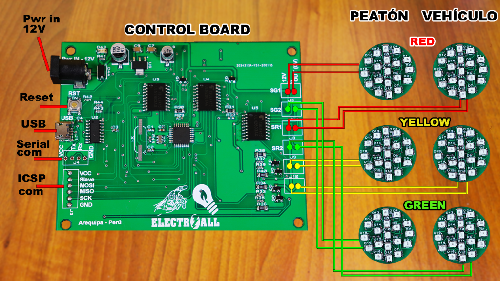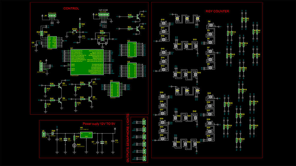 Estoy completamente seguro que todos absolutamente todos hemos visto un semáforo en las calles, y como electrónicos en algún momento hemos querido construir uno, déjenme contarles que crear todo un sistema de un semáforo era mi reto desde hace mucho tiempo; pues ahora ya lo tengo completamente funcional. En este video les quiero enseñar paso a paso como se ha realizado este proyecto, pues veremos desde la construcción del esquemático electrónico, el diseño pcb, el desarrollo de la programación y finalmente veremos la practica en físico y, lo que más me encanta de este semáforo es que tendremos contadores descendentes de 3 colores; verde, amarillo y rojo, asimismo, se contará con 3 luces señalizadores de colores verde, amarillo y rojo.