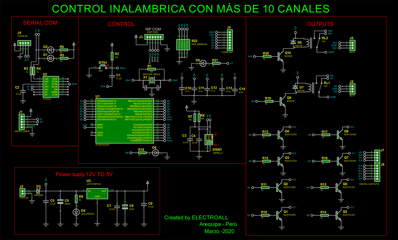 Hoy en día existen varios tipos de comunicaciones inalambricas desde lo más simple hasta lo más complejo, una de las primeras comunicaciones es la comunicación RF como también conocido como Radio Frecuencia, al decir verdad este es una de las comunicaciones más sencillas de manejar. Por ende, en este episodio usaremos los módulos de radio frecuencia. En los mercado usualmente se encuentra módulos de Radio frecuencia con 4 canales, lo que significa que solo se podrá controlar 4 salidas individualmente, esto puede ser muy útil si se trata de controlar menos de 4 salidas, ahora, si se quiere controlar más de 4 salidas este deja de ser útil, sin embargo, si agregamos un microcontrolador al circuito receptor del RF se podrá controlar más de 10 salidas. Para ello crearemos una tarjeta PCB que tendrá 8 salidas de transistores y dos salidas de relays.