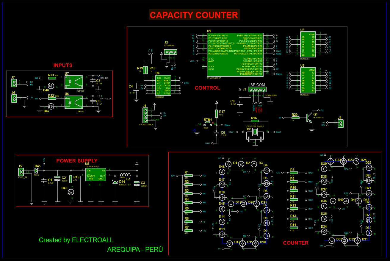 /* CREADO POR :{==[=======>>>> ELECTROALL <<<<<=======]==} INSTAGRAM : https://www.instagram.com/carlos_j_fuentess/ ó @carlos_j_fuentess FACEBOOK : https://web.facebook.com/ELECTROALL.ELECTRONICA/?_rdc=1&_rdr PÁGINA WEB : https://www.electroallweb.com/ YOUTUBE : https://www.youtube.com/c/ELECTROALL ________________________________________________________ {==[=======> (CONTADOR DE AFORO DE PERSONAS, PROYECTO COVID) <=======]==} ________________________________________________________ */ // no cambiar las el const int const int pulsador_asc = 2; // ENTRADA IN1 PARA CONTAR ASCENDENTEMENTE // ascendentes const int pulsador_des = 3; // ENTRADA IN2 PARA CONTAR DESCENDENTEMENTE // descendentes //VARIABLES PARA EL CONTADOR ASCENDIENTE // estas variables si puede ser cambiado int contador = 0; // contador para el numero de veces presinados int estado_pulsador_asc = 0; // estado actual del pulsador int lastButtonState_asc = 1; // estado anterior del pulsador //VARIABLES PARA EL CONTADOR DESCENDIENTE // estas variables si puede ser cambiado int estado_pulsador_des = 0; // estado actual del pulsador int lastButtonState_des = 1; // estado anterior del pulsador const int sir = 18; ////////////////////////////////////////////////// int a = 11; /////////////////////////////////////// int b = 12; /////////////////////////////////////// int c = 13; ///////////////////////////////////////PINES PARA EL CONTADOR int d = 14; ///////////////////////////////////////DE UNIDADES int e = 15; /////////////////////////////////////// int f = 16; /////////////////////////////////////// int g = 17; /////////////////////////////////////// int A = 4; /////////////////////////////////////// int B = 5; /////////////////////////////////////// int C = 6; /////////////////////////////////////// int D = 7; ///////////////////////////////////////PINES PARA EL CONTADOR int E = 8; ///////////////////////////////////////DE DECENAS int F = 9; /////////////////////////////////////// int G = 10; /////////////////////////////////////// ///////////////////////////////////////////////////// int uno [7] = {a, b, c, d, e, f, g}; // UNIDADES int dos [7] = {A, B, C, D, E, F, G}; // DECENAS //--UNIDADES--///////////////////////////////////////// int unidad0 [7] = {1, 1, 1, 1, 1, 1, 0}; //= #0 int unidad1 [7] = {0, 1, 1, 0, 0, 0, 0}; //= #1 int unidad2 [7] = {1, 1, 0, 1, 1, 0, 1}; //= #2 int unidad3 [7] = {1, 1, 1, 1, 0, 0, 1}; //= #3 int unidad4 [7] = {0, 1, 1, 0, 0, 1, 1}; //= #4 int unidad5 [7] = {1, 0, 1, 1, 0, 1, 1}; //= #5 int unidad6 [7] = {1, 0, 1, 1, 1, 1, 1}; //= #6 int unidad7 [7] = {1, 1, 1, 0, 0, 0, 0}; //= #7 int unidad8 [7] = {1, 1, 1, 1, 1, 1, 1}; //= #8 int unidad9 [7] = {1, 1, 1, 1, 0, 1, 1}; //= #9 //--DECENAS--//////////////////////////////////////////// int decena0 [7] = {1, 1, 1, 1, 1, 1, 0}; //= #0 int decena1 [7] = {0, 1, 1, 0, 0, 0, 0}; //= #1 int decena2 [7] = {1, 1, 0, 1, 1, 0, 1}; //= #2 int decena3 [7] = {1, 1, 1, 1, 0, 0, 1}; //= #3 int decena4 [7] = {0, 1, 1, 0, 0, 1, 1}; //= #4 int decena5 [7] = {1, 0, 1, 1, 0, 1, 1}; //= #5 int decena6 [7] = {1, 0, 1, 1, 1, 1, 1}; //= #6 int decena7 [7] = {1, 1, 1, 0, 0, 0, 0}; //= #7 int decena8 [7] = {1, 1, 1, 1, 1, 1, 1}; //= #8 int decena9 [7] = {1, 1, 1, 1, 0, 1, 1}; //= #9 int counter = 0; //CONTADOR UNIDADES int contadorD = 0; //CONTADOR DECENAS int counter1 = 0; // CONTADOR PARA EL CAMBIO DE COLOR void setup() { Serial.begin(9600); pinMode(pulsador_asc, INPUT_PULLUP); //Resistencia de pullup interna pinMode(pulsador_des, INPUT_PULLUP); //Resistencia de pullup interna pinMode(sir, OUTPUT); for (byte i = 0; i < 7; i++) { pinMode (uno[i], OUTPUT); pinMode (dos[i], OUTPUT); } } void loop() { // almacenamos la lectura de la entrada de pin 2 estado_pulsador_asc = digitalRead(pulsador_asc); estado_pulsador_des = digitalRead(pulsador_des); // comparar el estado del botón a su estado anterior if (estado_pulsador_asc != lastButtonState_asc) { // si el estado fue cambiado, incremente el conteo digitalWrite(sir, 1); if (estado_pulsador_asc == HIGH) { // si el estado actual es alto, entonces // que pase de off a on: digitalWrite(sir, 0); if (counter < 99) { contador++; counter++; Serial.print("CONTEO= "); Serial.println(contador); Serial.print("CONTEO_sis= "); Serial.println(counter); delay(100); if (counter == 10 || counter == 20 || counter == 30 || counter == 40 || counter == 50 || counter == 60 || counter == 70 || counter == 80 || counter == 90) { contadorD++; delay(100); } } } } lastButtonState_asc = estado_pulsador_asc; // comparar el estado del botón a su estado anterior if (estado_pulsador_des != lastButtonState_des ) { // si el estado fue cambiado, decrementa el conteo digitalWrite(sir, 1); if (estado_pulsador_des == HIGH) { // si el estado actual es alto, entonces // que pase de off a on: digitalWrite(sir, 0); if (counter > 0 ) { contador--; counter--; Serial.print("CONTEO= "); Serial.println(contador); Serial.print("CONTEO_sis= "); Serial.println(counter); delay(100); if (counter == 9 || counter == 19 || counter == 29 || counter == 39 || counter == 49 || counter == 59 || counter == 69 || counter == 79 || counter == 89) { contadorD--; delay(100); } if (contador == -1) { contador = 9; } } } } //guarda el último estado actual como el ultimo estado //para el proximo bucle lastButtonState_des = estado_pulsador_des; if (contador == 10) { contador = 0; } switch (contador) { case 0: for (byte i = 0; i < 7; i++) { digitalWrite (uno[i], unidad0[i]); } break; case 1: for (byte i = 0; i < 7; i++) { digitalWrite (uno[i], unidad1[i]); } break; case 2: for (byte i = 0; i < 7; i++) { digitalWrite (uno[i], unidad2[i]); } break; case 3: for (byte i = 0; i < 7; i++) { digitalWrite (uno[i], unidad3[i]); } break; case 4: for (byte i = 0; i < 7; i++) { digitalWrite (uno[i], unidad4[i]); } break; case 5: for (byte i = 0; i < 7; i++) { digitalWrite (uno[i], unidad5[i]); } break; case 6: for (byte i = 0; i < 7; i++) { digitalWrite (uno[i], unidad6[i]); } break; case 7: for (byte i = 0; i < 7