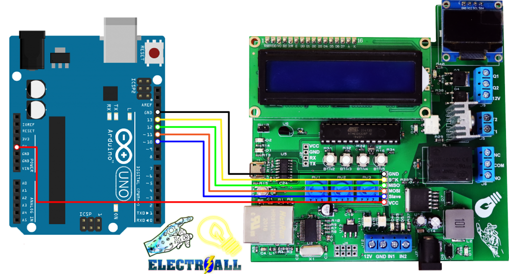 finalmente para quemar el bootloader se tendrá que realizar a través de los pines ISP, que prácticamente serían los pines [ (MOSI=11) (MISO = PIN12) (SCK=PIN13) (Slave=PIN10) ]. Para subir y quemar el gestor de arranque necesitaremos un arduino UNO ó MEGA y realizar las siguientes conexiones (ARDUINO UNO – MAIN BOARD).