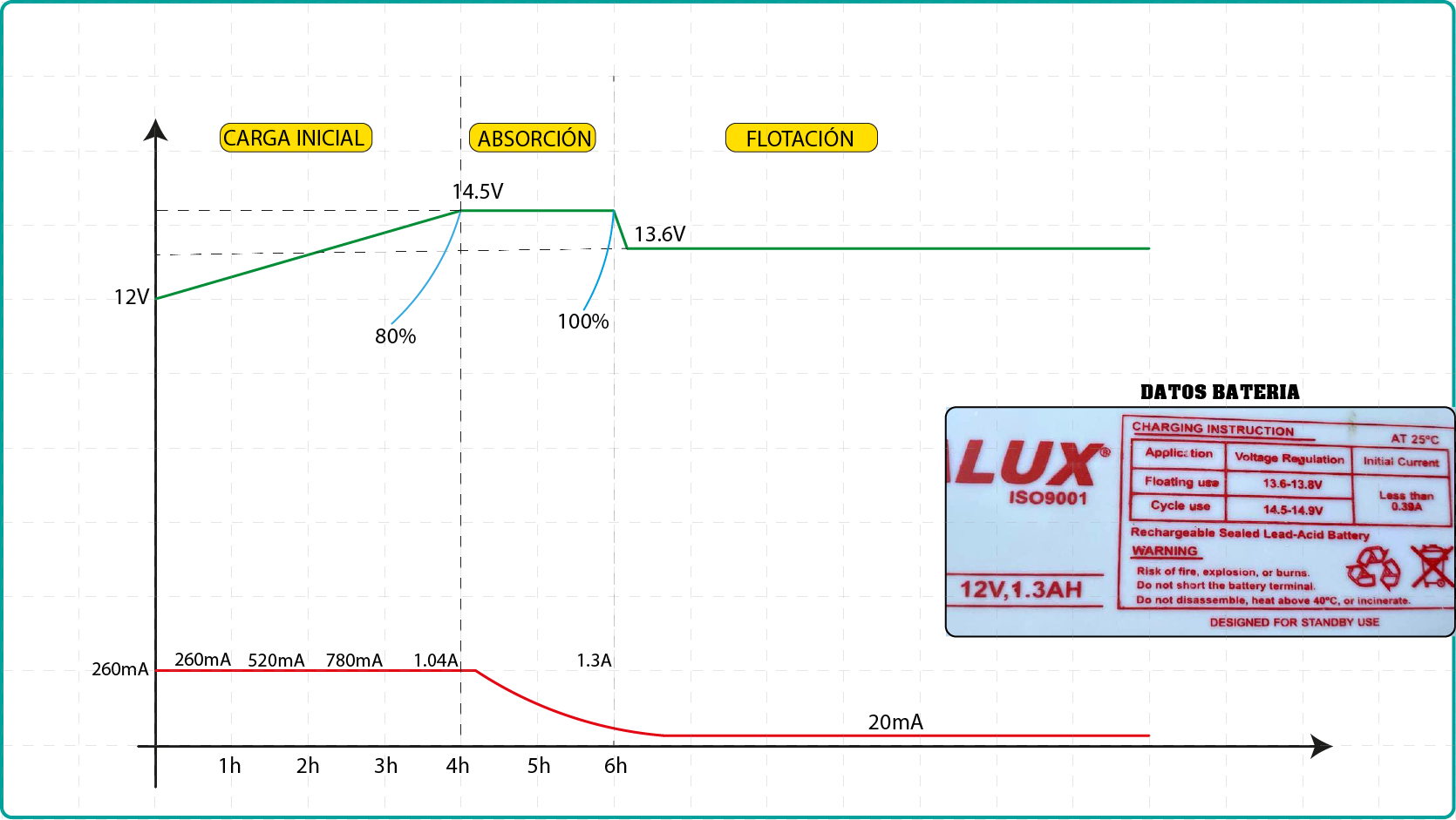 Para entender completamente de como cargar o tratar una batería primero debemos consultar la hoja de datos de la batería a usar, para este episodio vamos a usar de ejemplo una batería de plomo ácido de 12V y 1.3AH. Entonces, para tener un control eficiente de baterías se tiene que cumplir el proceso de carga en 3 etapas: carga inicial, Absorción, Flotación. Muy bien, en esta parte les pido que presten mucha atención ya que vamos hacer un ejemplo práctico con la batería que vamos a usar según los datos técnicos (imagen abajo). Lógicamente la carga inicial comprende de 12V a 14.5V, es decir, el controlador proporcionará una carga rápida desde 12V hasta llegar a 14.5 voltios y la corriente en esta etapa debe mantenerse en el 10 y el 20% de su capacidad nominal. Es decir, si la batería que tenemos es de 1.3Ah entonces el cargador debe proporcionar como máximo el 20% lo cual sería 260mA hasta alcanzar el 80% , En cuanto la carga de absorción va desde 14.5 -14.9V, en etapa la corriente disminuye lentamente hasta completar el 20%, una vez completado entra a la tercera etapa de flotación que comprende desde 13.6 a 13.8V, con una corriente constante baja. Cabe recalcar que en esta última etapa se tiene que mantenerse el voltaje.